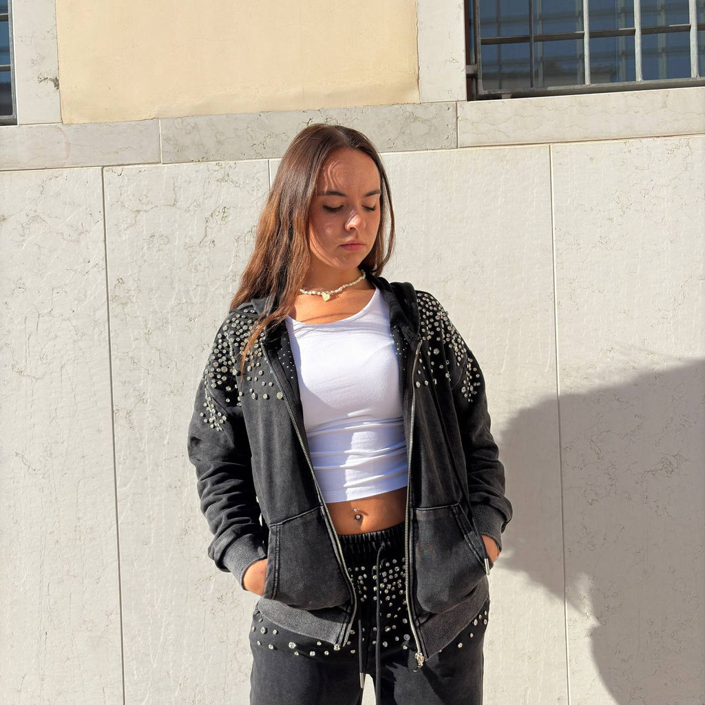 Lasciati conquistare dal comfort e dallo stile con questo coordinato tuta unico: felpa con cappuccio, cerniera frontale e tasche, impreziosita da scintillanti strass che catturano ogni sguardo. Il pantalone a palazzo riprende lo stesso charme con strass nella parte superiore, mentre la culisse regolabile garantisce vestibilità perfetta e massimo comfort. Ideale per chi vuole sentirsi elegante anche nei momenti casual: abbinalo con sneakers o tacchi per un look che non passa inosservato.