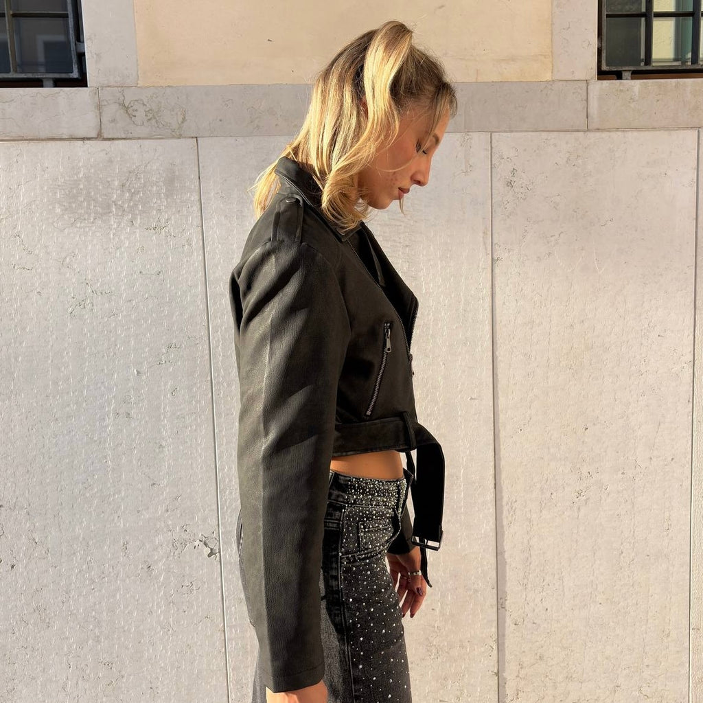 Giacca in ecopelle dal design audace e contemporaneo, con colletto classico che dona un tocco di eleganza. La chiusura asimmetrica tramite cerniera storta aggiunge un elemento grintoso e moderno al capo. Le tasche laterali, anch'esse con chiusura a cerniera, offrono praticità e stile. Un finto taschino sul petto contribuisce all’estetica ricercata. Il dettaglio del cinturino regolabile in vita completa il look, permettendo di personalizzare la vestibilità per un tocco finale deciso e raffinato. Una giacca perfetta per chi ama distinguersi con carattere.